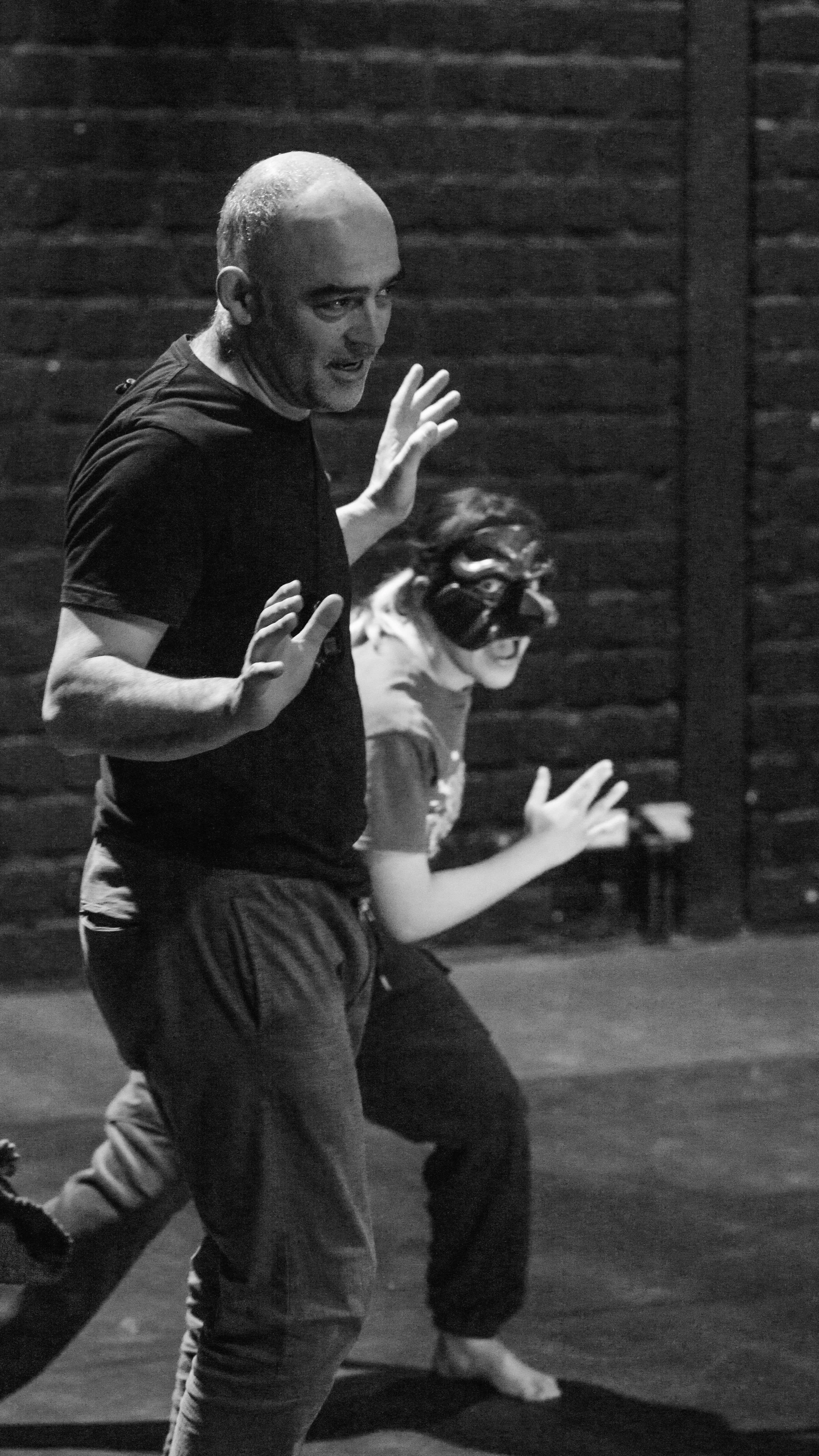 This approach is deeply rooted in Carlos’ extensive research and practice in movement, mask performance, and dramatic tension. Central to this approach is the mask and the space it inhabits, transforming performance into a dynamic interplay of movement and meaning.
